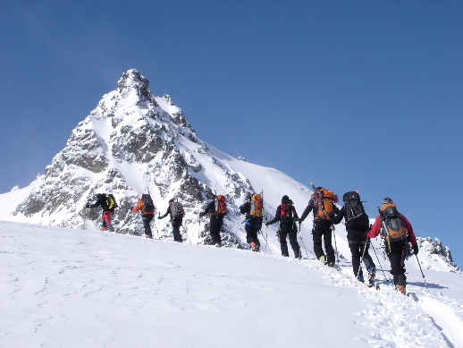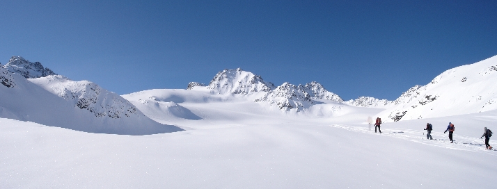 Am nächsten Tag war wider erwarten strahlend blauer Himmel. Aufbruch nach dem Frühstück. Robert erklärte uns anhand eines Schneeblocks (ca. 40 x 40 cm) den Aufbau der Schneedecke. Es wurde uns bewusst, wie gefährlich einzelne Schichten zu beurteilen sind. In 2 Fünfer-Seilschaften ging es den Berg hoch. Unsere Guides wiesen uns immer wieder auf die Gefahren des Geländes hin. Wie ist das Gelände einzuschätzen? Wie steil sind die Hänge? Welche Ausrichtung haben die Hänge? Gab es Neuschneezuwachs? Spitzkehren wurden geübt und als Highlight die Abfahrt in der Seilschaft! Gar nicht einfach! Nach einer Stärkung in einer atemberaubenden Kulisse wurde mit 2 Vierer-Seilschaften das Bergen einer Person aus einer Gletscherspalte geübt. Bei lachender Sonne und angenehmen Temperaturen machte es uns allen sichtlich Spaß.